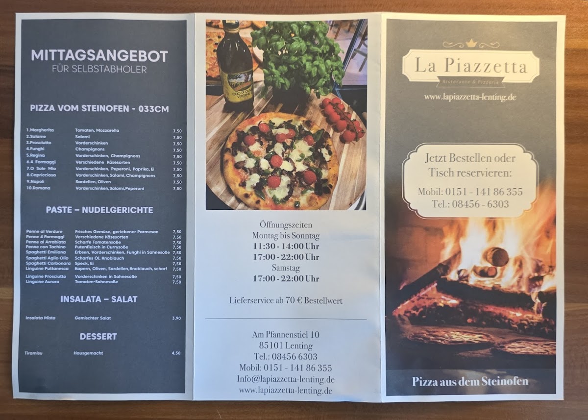 Welcome to La Piazetta Ristorante Pizzeria, located at Am Pfannenstiel 10, Lenting, Germany. This charming establishment promises a delightful dining experience with an inviting atmosphere, ideal for families and dog lovers alike.